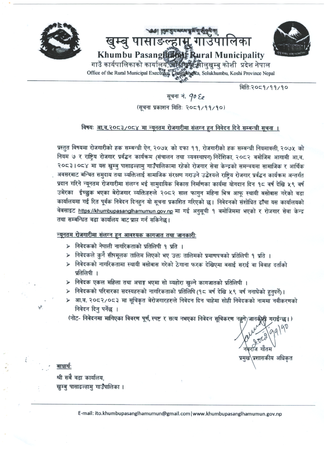 / आ.व. २०८३/०८४ मा न्यूनतम रोजगारीमा संलग्न हुन निवेदन दिने सम्बन्धी सूचना । | खुम्बु पासाङल्हामु गाउँपालिका(Khumbu Pasang Lhamu Rural Municipality)