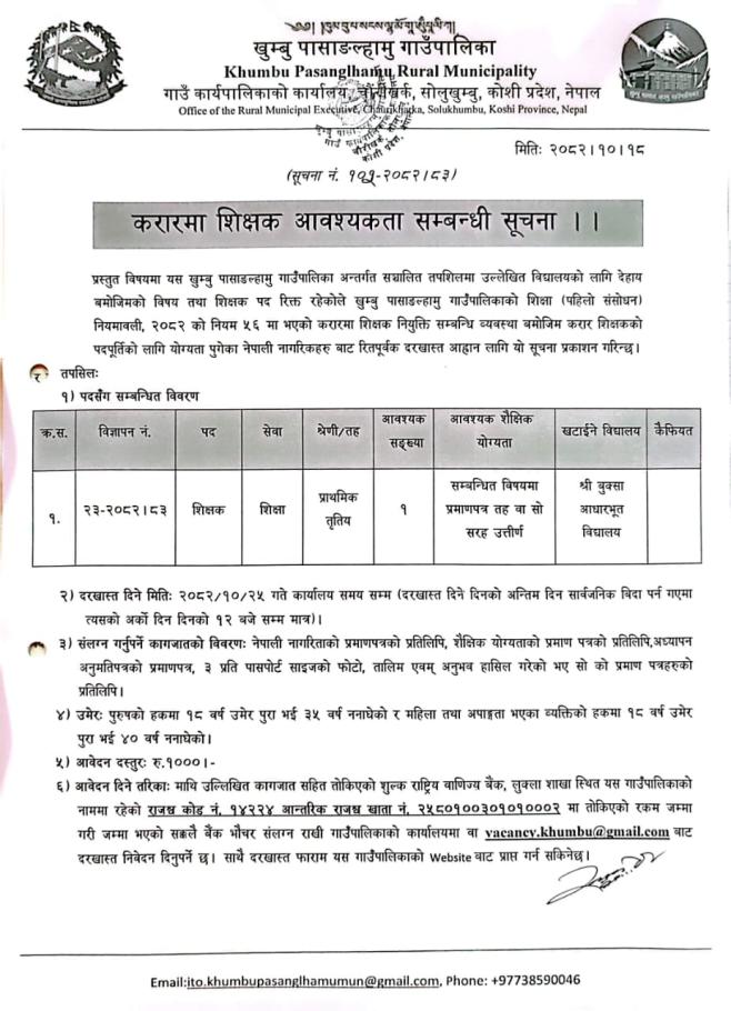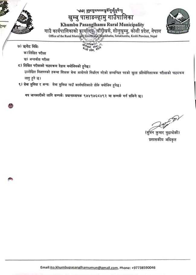 / करारमा शिक्षक आवश्कता सम्बन्धी सूचना । | खुम्बु पासाङल्हामु गाउँपालिका(Khumbu Pasang Lhamu Rural Municipality)