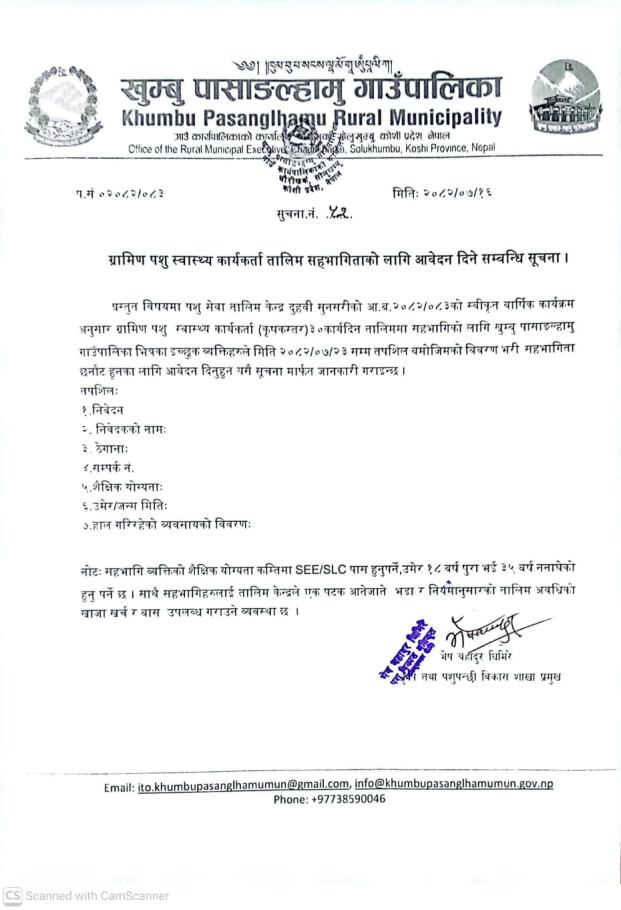 / ग्रामिण पशु स्वास्थ्य कार्यकर्ता तालिम सहभागिताको लागि आवेदन दिने सम्बन्धी सूचना । | खुम्बु पासाङल्हामु गाउँपालिका(Khumbu Pasang Lhamu Rural Municipality)