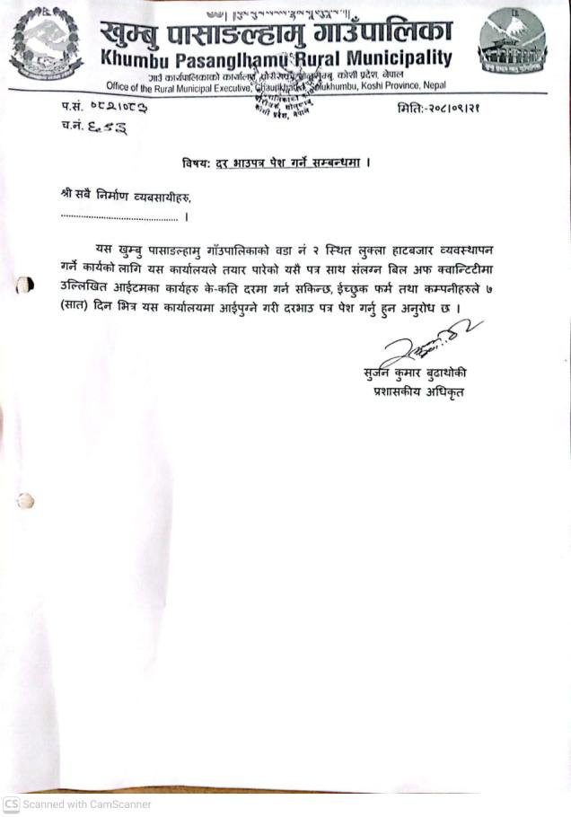 / दर भाउपत्र पेश गर्ने सम्बन्धमा । | खुम्बु पासाङल्हामु गाउँपालिका(Khumbu Pasang Lhamu Rural Municipality)