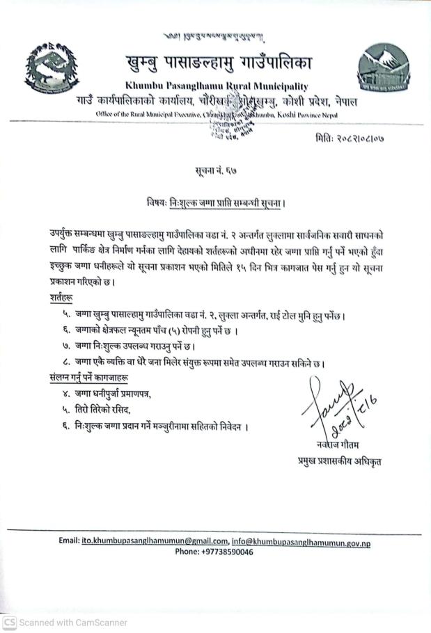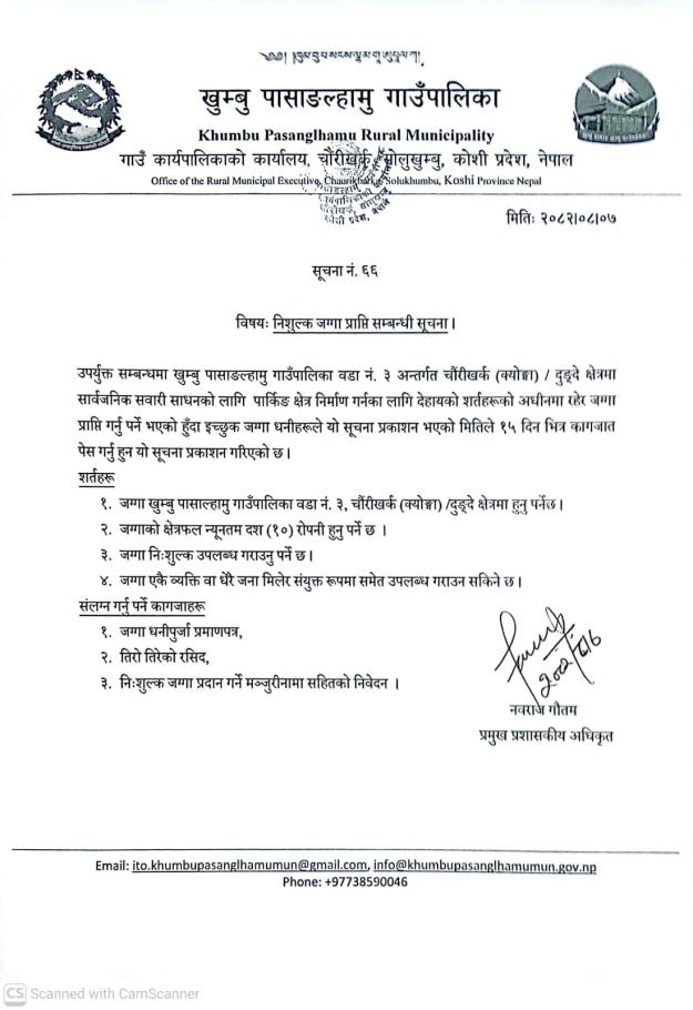 / नि:शुल्क जग्गा प्राप्ति सम्बन्धी सूचना । | खुम्बु पासाङल्हामु गाउँपालिका(Khumbu Pasang Lhamu Rural Municipality)
