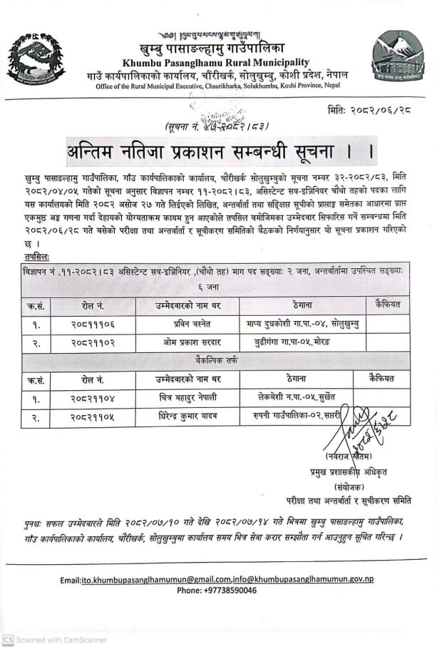 / विज्ञापन नं. ११-२०८२/८३, सुचना नं. ४७ ,अन्तिम नतिजा प्रकाशन सम्बन्धी सूचना । | खुम्बु पासाङल्हामु गाउँपालिका(Khumbu Pasang Lhamu Rural Municipality)