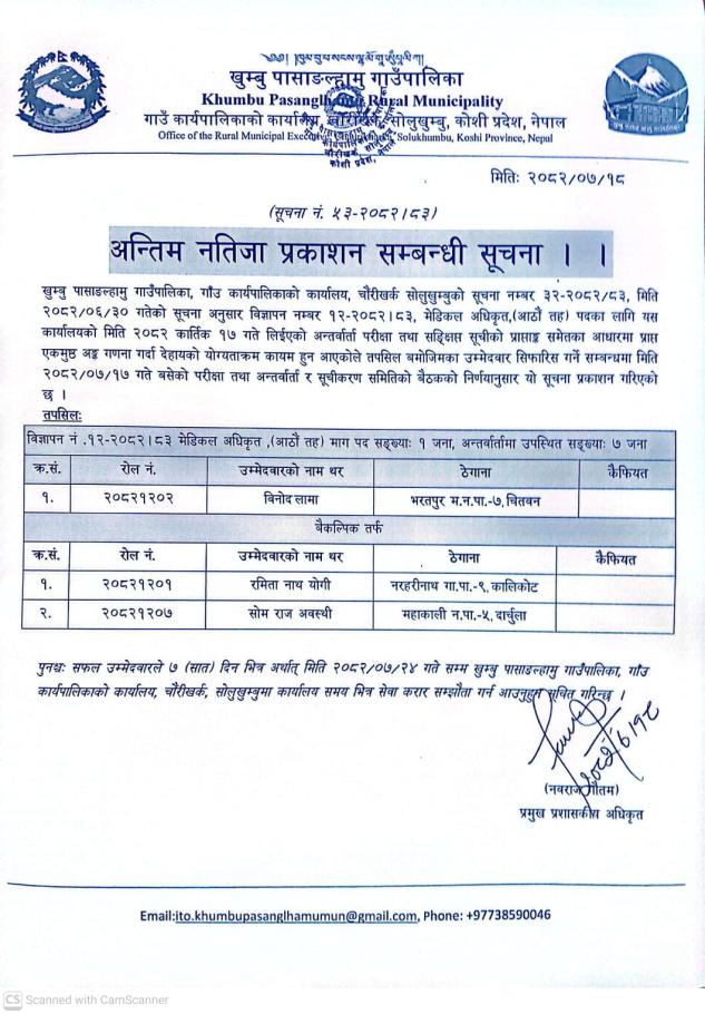 / विज्ञापन नं. १२-२०८२/८३, मेडिकल अधिकृत आठौं तह को अन्तिम नतिजा प्रकाशन सम्बन्धी सूचना । | खुम्बु पासाङल्हामु गाउँपालिका(Khumbu Pasang Lhamu Rural Municipality)