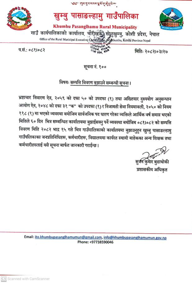 / सम्पत्ति विवरण बुझाउने सम्बन्धी सूचना ।। | खुम्बु पासाङल्हामु गाउँपालिका(Khumbu Pasang Lhamu Rural Municipality)