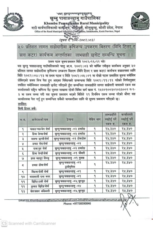 / ५० प्रतिशत लागत साझेदारीमा कृषिजन्य उपकरण वितरण (मिनि टिलर र ग्रास कटर) कार्यक्रम अन्तर्गतका लाभग्राही छनौट सम्बन्धि सुचना।। | खुम्बु पासाङल्हामु गाउँपालिका(Khumbu Pasang Lhamu Rural Municipality)