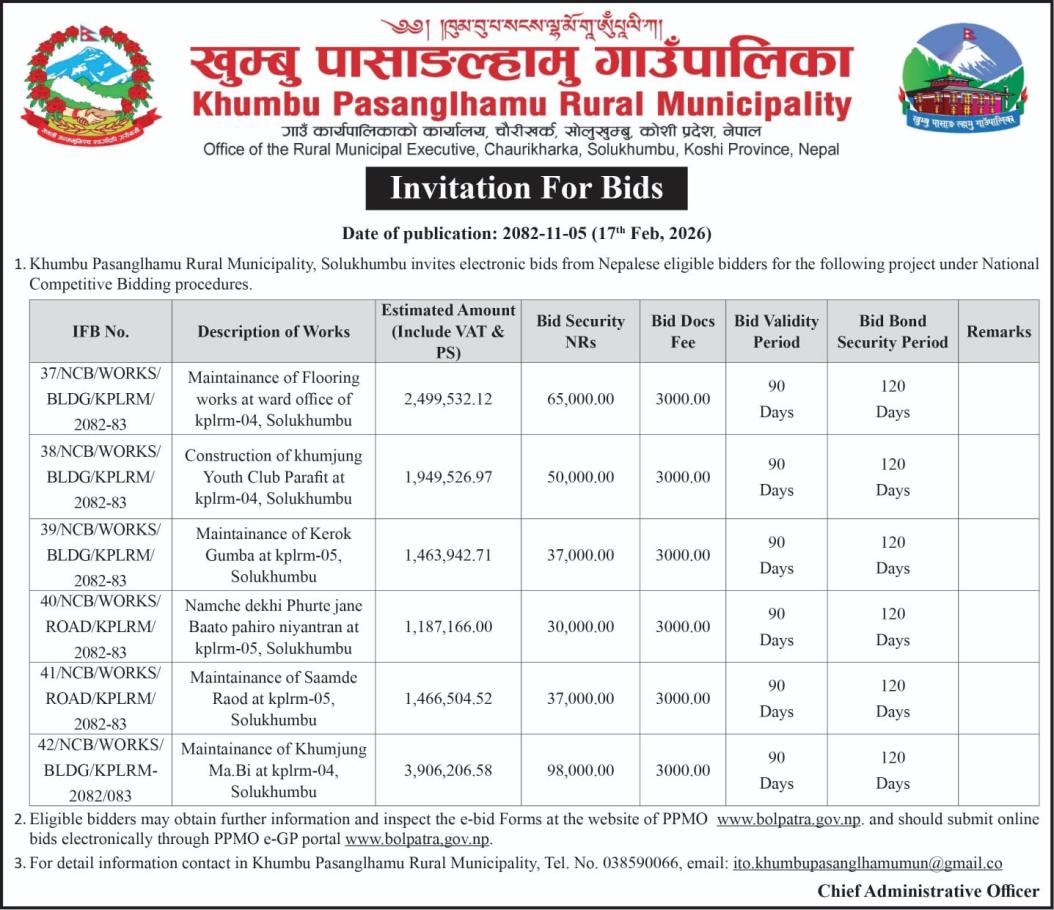 / Invitation For Bid for various projects in KPLRM | खुम्बु पासाङल्हामु गाउँपालिका(Khumbu Pasang Lhamu Rural Municipality)