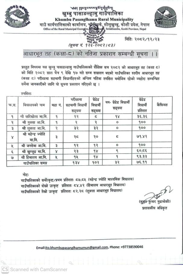 / आधारभूत तह (कक्षा-८) को नतिजा प्रकाशन सम्बन्धी सूचना । | खुम्बु पासाङल्हामु गाउँपालिका(Khumbu Pasang Lhamu Rural Municipality)