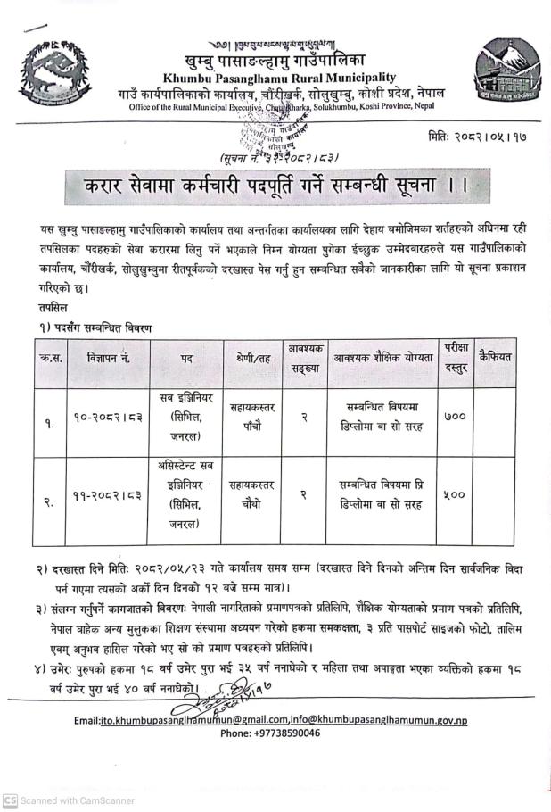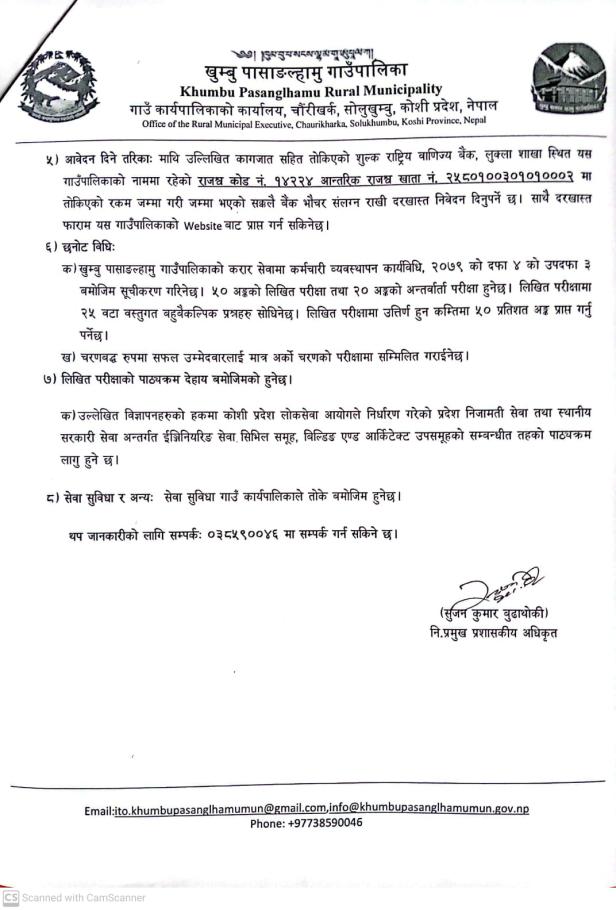 / करार सेवामा कर्मचारी पदपूर्ति गर्ने सम्बन्धी सूचना ।। | खुम्बु पासाङल्हामु गाउँपालिका(Khumbu Pasang Lhamu Rural Municipality)