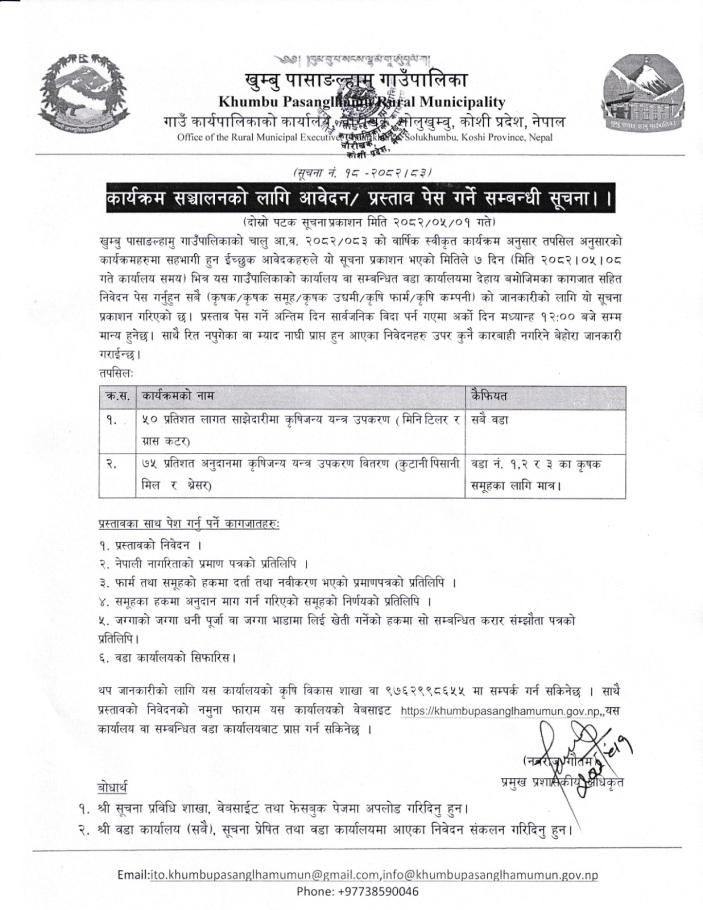 / कार्यक्रम संचालनको लागि आवेदन/प्रस्ताव पेस गर्ने सम्बन्धी दोस्रो पटक प्रकाशित सूचना !!! | खुम्बु पासाङल्हामु गाउँपालिका(Khumbu Pasang Lhamu Rural Municipality)