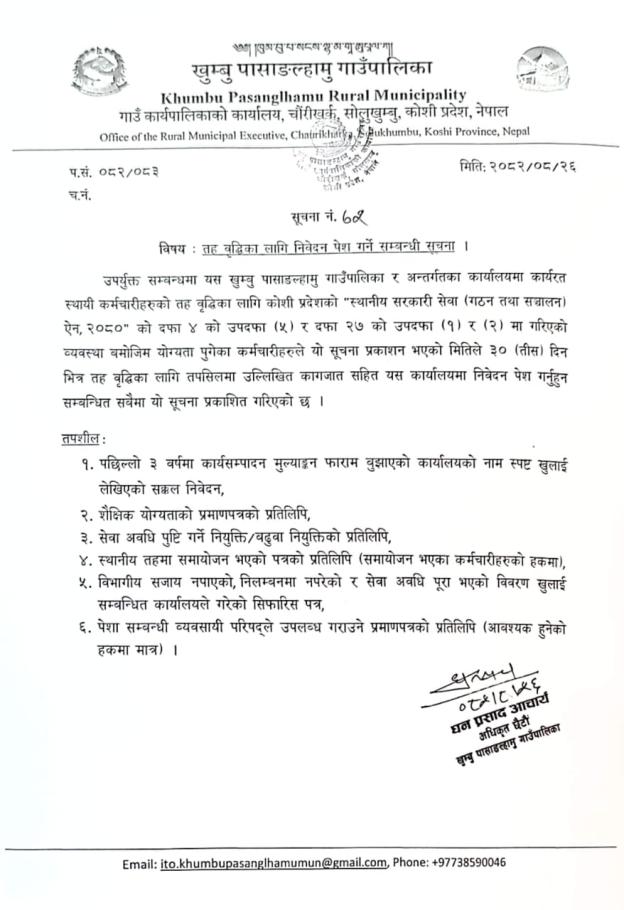 / तह वृद्धिका लागि निवेदन पेश गर्ने सम्बन्धी सूचना । | खुम्बु पासाङल्हामु गाउँपालिका(Khumbu Pasang Lhamu Rural Municipality)