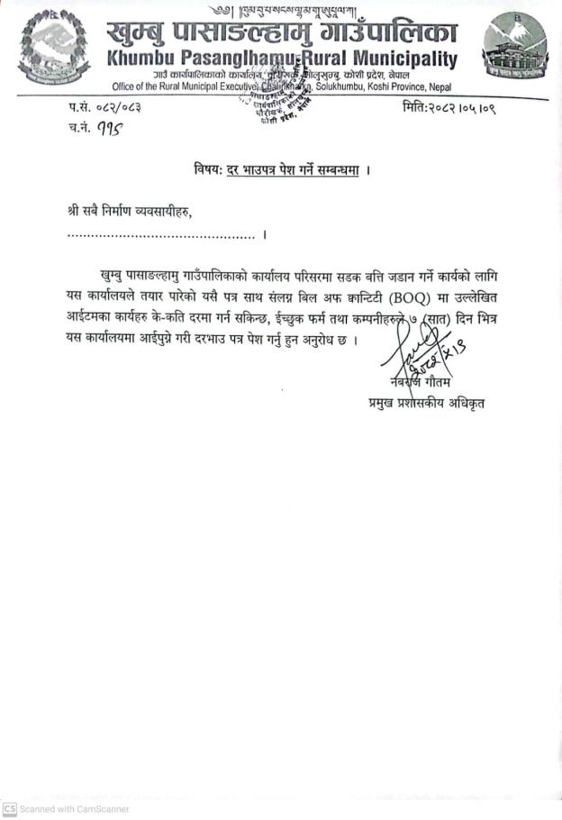 / दर भाउपत्र पेश गर्ने सम्बन्धमा । | खुम्बु पासाङल्हामु गाउँपालिका(Khumbu Pasang Lhamu Rural Municipality)