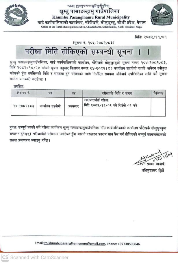 / परिक्षा मिति तोकिएको सम्बन्धी सूचना । | खुम्बु पासाङल्हामु गाउँपालिका(Khumbu Pasang Lhamu Rural Municipality)