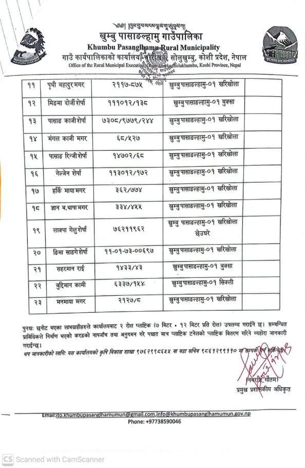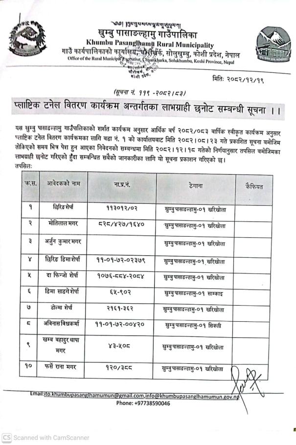 / प्लाष्टिक टनेल वितरण कार्यक्रम अन्तर्गतका लाभग्राही छनोट सम्बन्धी सूचना । | खुम्बु पासाङल्हामु गाउँपालिका(Khumbu Pasang Lhamu Rural Municipality)