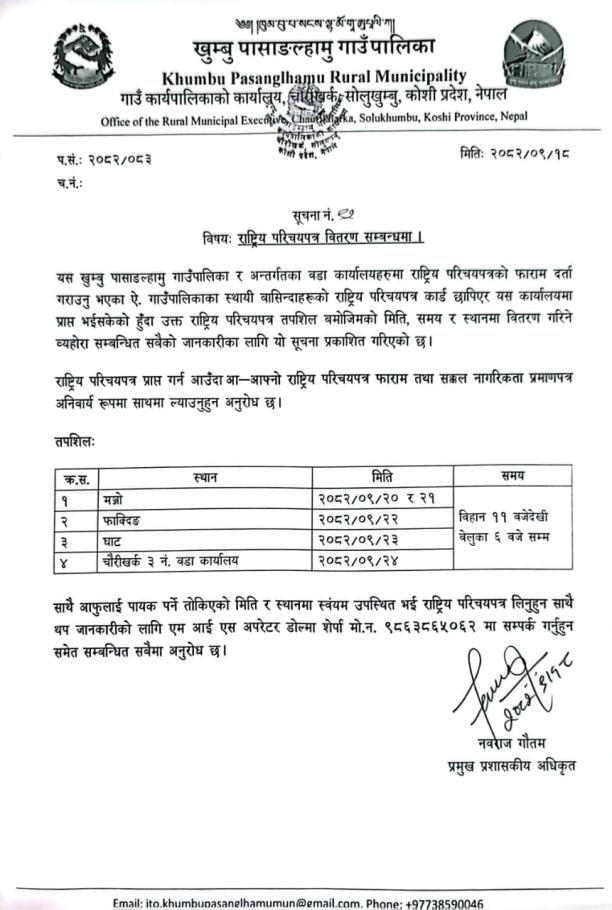 / राष्ट्रिय परिचयपत्र वितरण सम्बन्धमा । | खुम्बु पासाङल्हामु गाउँपालिका(Khumbu Pasang Lhamu Rural Municipality)