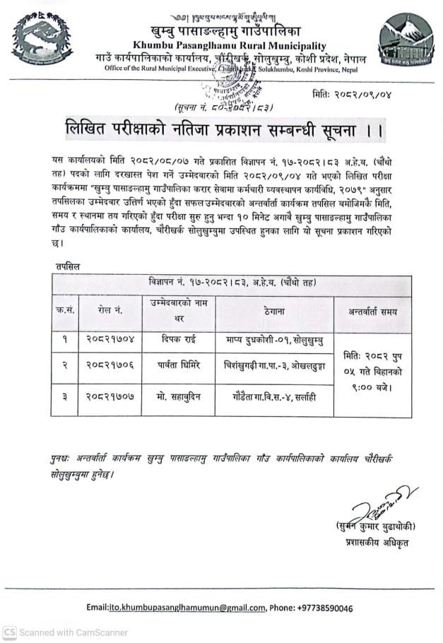/ लिखित परीक्षा नतिजा प्रकाशन सम्बन्धी सूचना । | खुम्बु पासाङल्हामु गाउँपालिका(Khumbu Pasang Lhamu Rural Municipality)