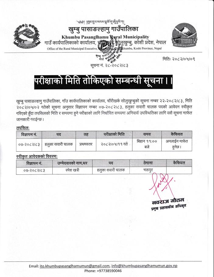 / विज्ञापन नं. ०७-२०८२/८३, हलुका सवारी चालकको परीक्षाको मिति तोकिएको सम्बन्धी सूचना ।। | खुम्बु पासाङल्हामु गाउँपालिका(Khumbu Pasang Lhamu Rural Municipality)
