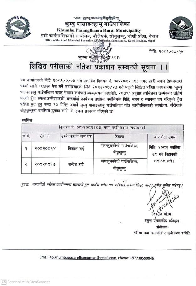 / विज्ञापन नं. ०८-२०८२/८३ नगर प्रहरी जवान प्रथमस्तर पदको लिखित परीक्षाको नतिजा प्रकाशन सम्बन्धी सूचना। | खुम्बु पासाङल्हामु गाउँपालिका(Khumbu Pasang Lhamu Rural Municipality)