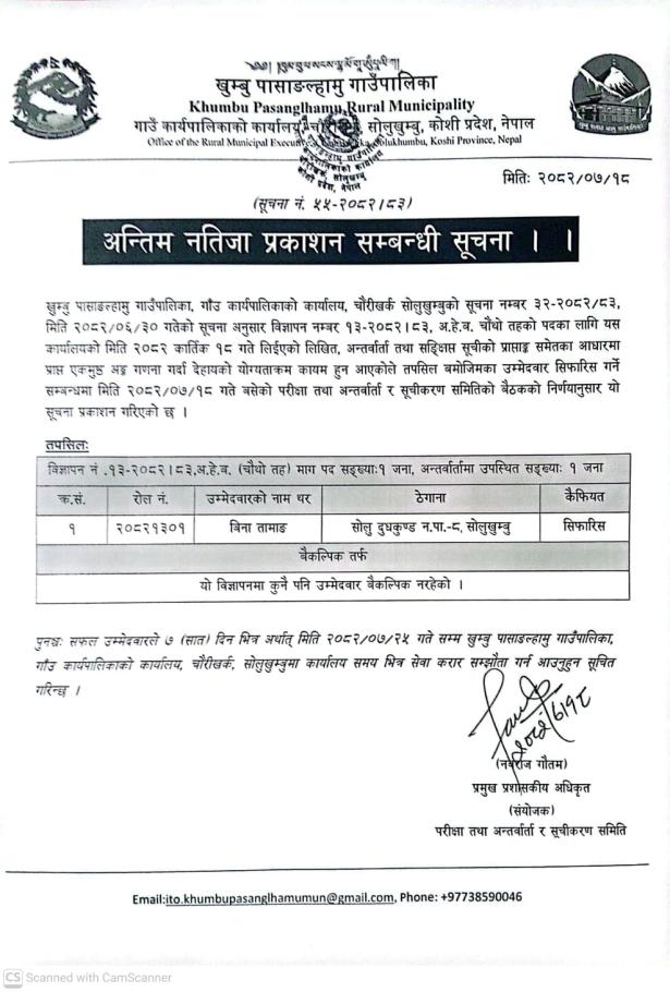 / विज्ञापन नं. १३-२०८२/८३, अ.हे.ब.(चौंथो तह) को अन्तिम नतिजा प्रकाशन सम्बन्धी सूचना । | खुम्बु पासाङल्हामु गाउँपालिका(Khumbu Pasang Lhamu Rural Municipality)