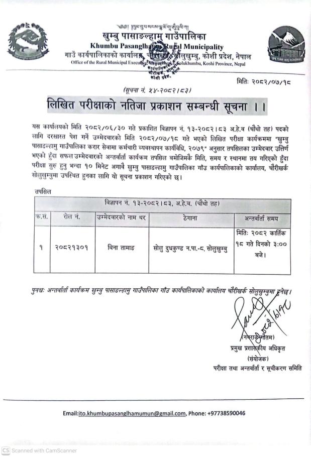 / विज्ञापन नं. १३-२०८२/८३, अ.हे.व.(चौंथो तह) को लिखित परिक्षाको नतिजा प्रकाशन सम्बन्धी सूचना । | खुम्बु पासाङल्हामु गाउँपालिका(Khumbu Pasang Lhamu Rural Municipality)