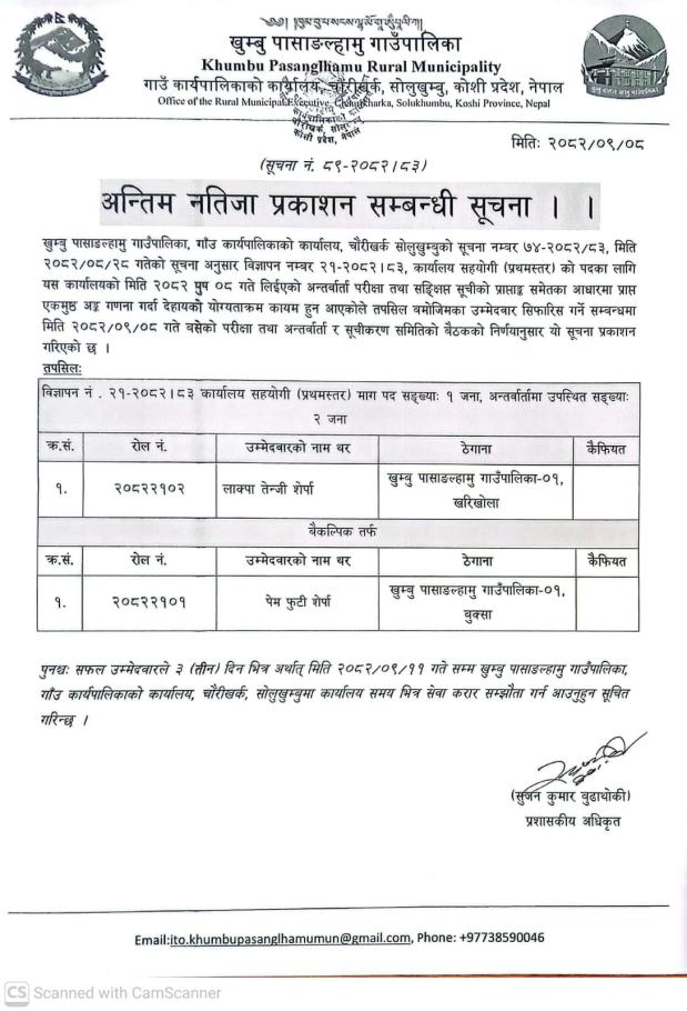 / विज्ञापन नं. २१-२०८२/८३, कार्यालय सहयोगी (प्रथमस्तर) , पदको अन्तिम नतिजा प्रकाशन सम्बन्धी सूचना । | खुम्बु पासाङल्हामु गाउँपालिका(Khumbu Pasang Lhamu Rural Municipality)