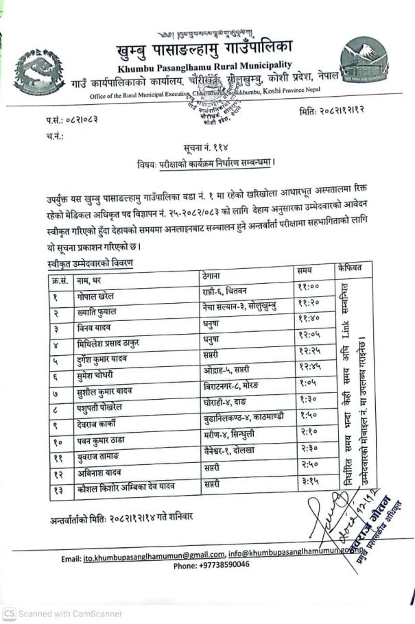 / विज्ञापन नं. २५-२०८२/०८३ मेडिकल अधिकृत पदको परीक्षा निर्धारण गरिएको सूचना। | खुम्बु पासाङल्हामु गाउँपालिका(Khumbu Pasang Lhamu Rural Municipality)