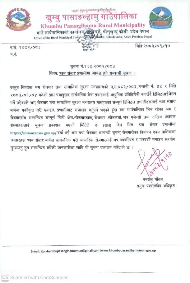 / "श्रम संसार" प्रणालीमा आवद्ध हुने सम्बन्धी सूचना। | खुम्बु पासाङल्हामु गाउँपालिका(Khumbu Pasang Lhamu Rural Municipality)