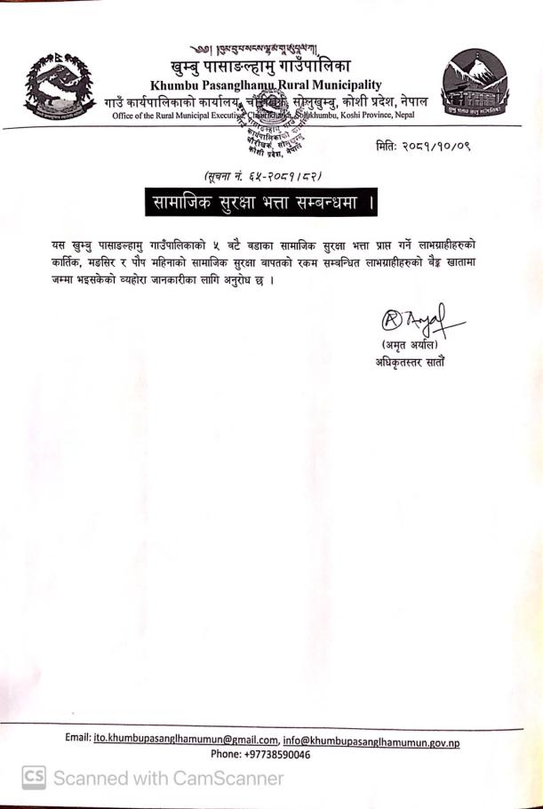 / सामाजिक सुरक्षा भत्ता सम्बन्धमा !!! | खुम्बु पासाङल्हामु गाउँपालिका(Khumbu Pasang Lhamu Rural Municipality)