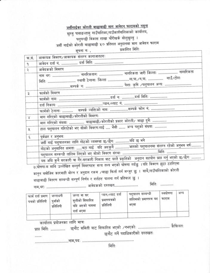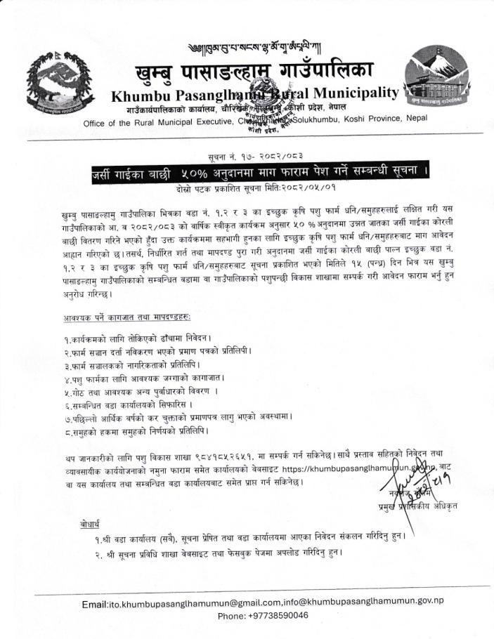 / ५० प्रतिशत अनुदानमा जर्सी गाईका बाछीका लागि माग फाराम पेश गर्ने सम्बन्धी दोस्रो पटक प्रकाशित सूचना !!! | खुम्बु पासाङल्हामु गाउँपालिका(Khumbu Pasang Lhamu Rural Municipality)