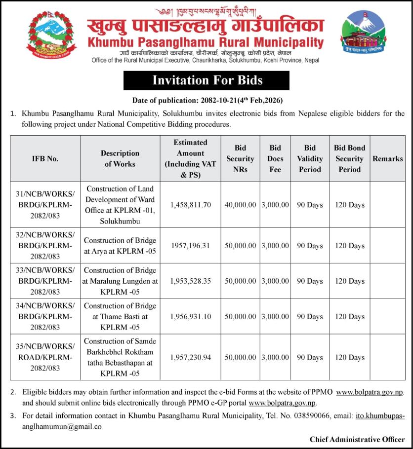 / Invitation for Bids | खुम्बु पासाङल्हामु गाउँपालिका(Khumbu Pasang Lhamu Rural Municipality)