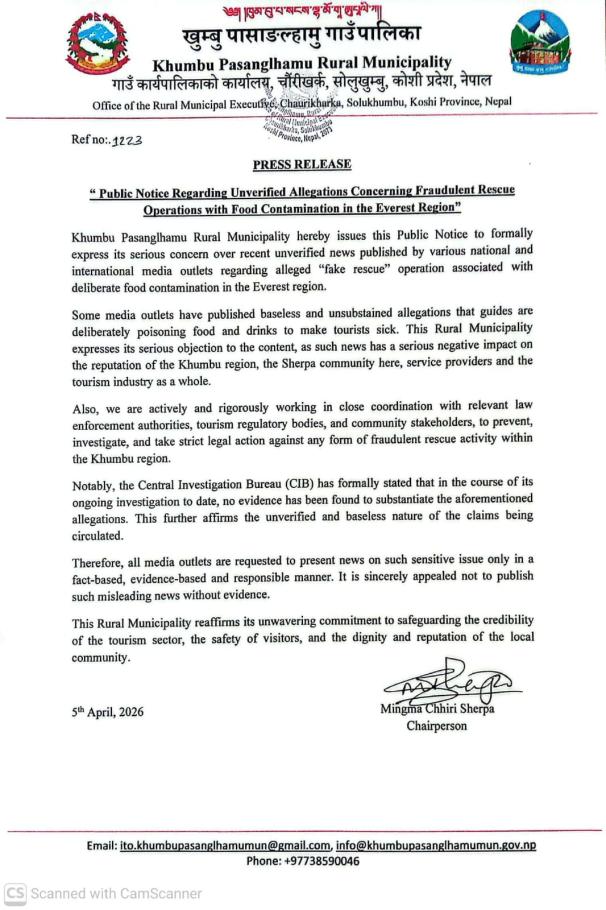 / Public Notice Regarding Unverified Allegations Concerning Fraudulent Rescue Operations with Food Contamination in the Everest Region. | खुम्बु पासाङल्हामु गाउँपालिका(Khumbu Pasang Lhamu Rural Municipality)