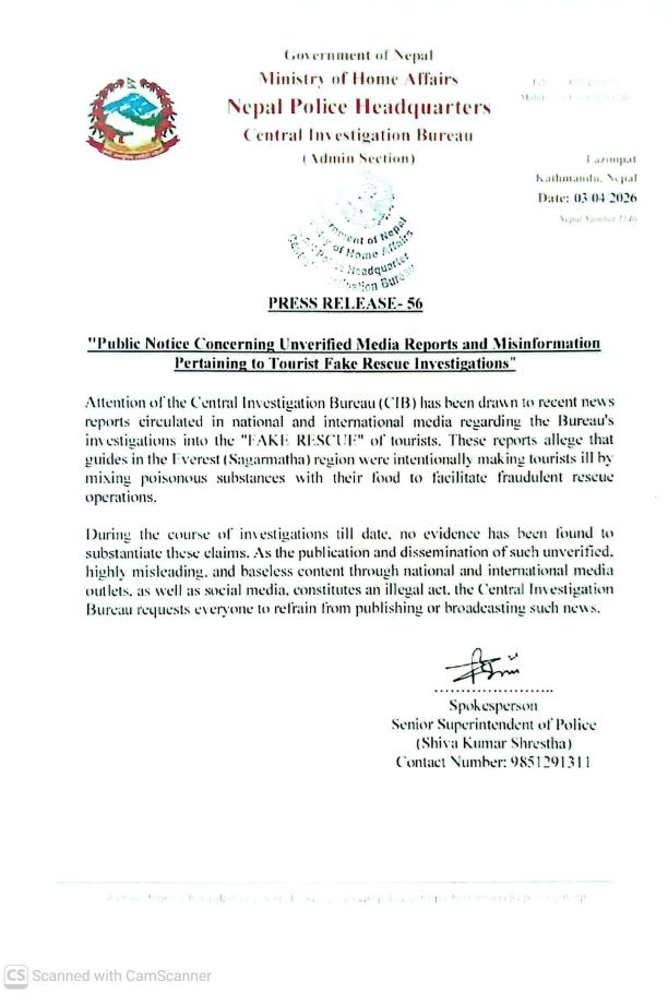 Public Notice Regarding Unverified Allegations Concerning Fraudulent Rescue Operations with Food Contamination in the Everest Region.
