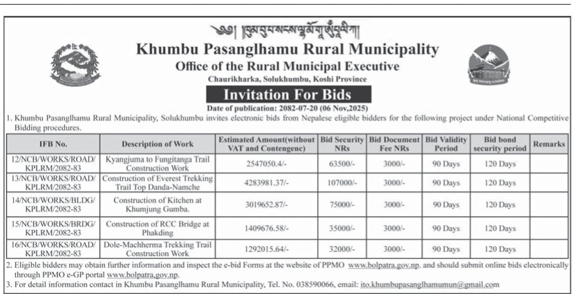 / खुम्बु पासाङल्हामु गाउँपालिकाको विभिन्न योजनाहरुको खुल्ला बोलपत्र आह्वान सम्बन्धी सूचना। | खुम्बु पासाङल्हामु गाउँपालिका(Khumbu Pasang Lhamu Rural Municipality)